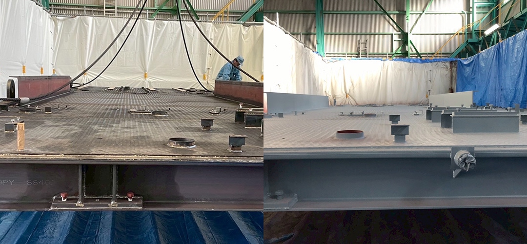 当社のエアーブラストは、鉄骨、配管、タンク、重機部品、工場設備などへ幅広く施工でき、高い除去力と均一な下地形成により、美しい仕上がりと塗装の長寿命化を実現します。