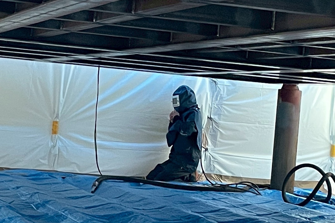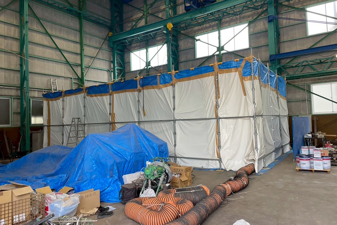 - 防塵シート、遮蔽パネル、マスキングを多重に使い、粉塵や研削材の飛散を抑えます。